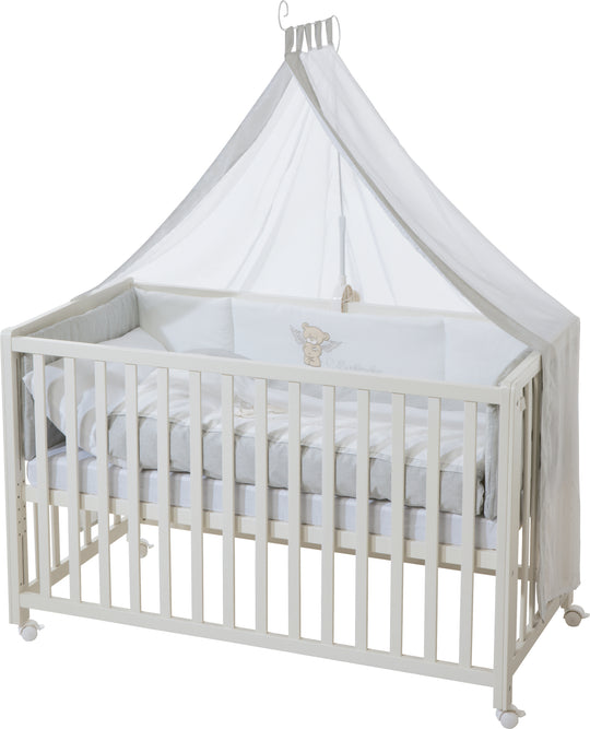 Im Lieferumfang enthalten sind Bettwäsche (Kissen 40 x 60 cm & Decke 100 x 135 cm), Nestchen, Himmel inkl. -stange, Matratze und Bremsrollenset, ein weiteres Seitengitter aus Holz und eine Bettseite mit Stoffwandung, die durch einen Reißverschluss geöffnet werden kann.