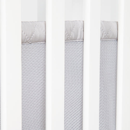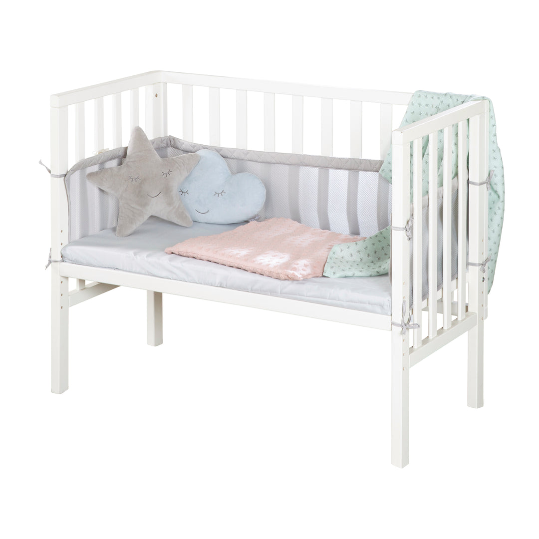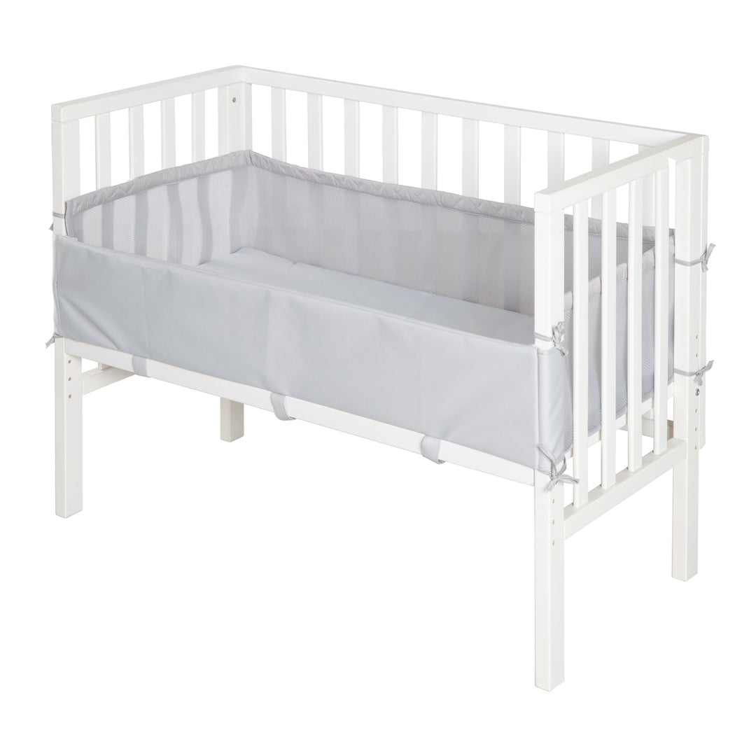 Das weiße roba Beistellbett 2in1 mit Barriere ist Beistellbett zum Elternbett und Kinderbank in einem und bietet ein optimales, sicheres Schlafklima.