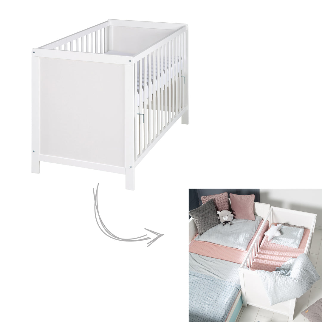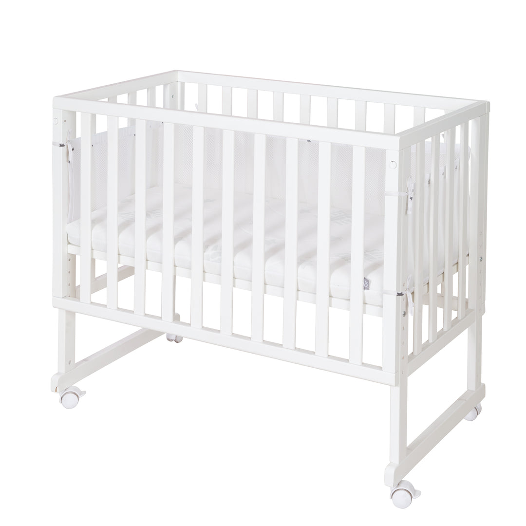 Tipp: Um die Sicherheit eines Überrollens zu beachten, verstellen Sie das Beistellbett immer etwas tiefer (ca. 5 – 8 cm), um einen „fließenden“ Übergang von Bett zu Beistelllösung zu vermeiden.