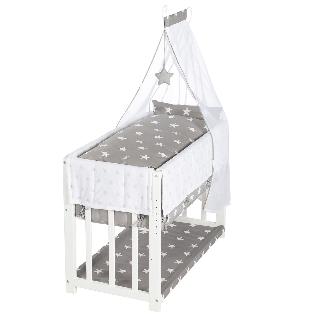 Entdecken Sie bei roba-kids hochwertige Beistellbetten – ob als multifunktionales Stubenbett im Bereich 50 x 90 cm oder unsere größeren Roombetten, die bereits eine Größe von 60 x 120 cm bieten. Achten Sie beim Kauf auf die im Abschnitt „Worauf beim Kauf eines geeigneten Beistellbettes achten?“ beschriebenen Qualitätskriterien und finden Sie passendes Zubehör, um Ihrem Baby optimalen Schlafkomfort zu gewährleisten. Sparen Sie bei der Auswahl einer atmungsaktiven und lufzirkulierenden Matratze nicht am falschen Ende und lassen sich von unserem Kundenservice gern über die Vorteile unserer safe asleep-Serie beraten. Je nach Wohnraum finden Sie eine passende Lösung, um Ihren kleinen Liebling jede Nacht in Ihrer Nähe zu haben – ein ausgestreckter Arm reicht!