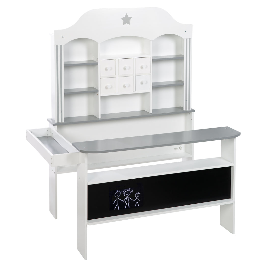 Aus dem Kinderzimmer schallt es mit gedämpfter Stimme: „Haben Sie auch Mehl und Zucker?“. Die Antwort erfolgt prompt: „Aber natürlich doch – möchten Sie auch noch Eier in Ihren Einkaufskorb?“. Kaufmannsläden lassen nicht nur die Augen junger Kinder groß werden, nein, auch Jugendliche und Erwachsene erinnern sich gern an die Zeit als es noch hieß: „Das macht jetzt aber 5 Mark!“. Mit großem Spaß füllen Kinder weltweit ihre Einkaufskörbe mit Spielzeugwaren und imitieren so Eltern, Geschwister und Bekannten bei den wöchentlichen Einkäufen von Milch, Eiern, Käse und Wurst. Voller Stolz steht die kleine Inhaberin bzw. der kleine Inhaber hinter der Verkaufstheke und begrüßt mit freudigem Lächeln die Gäste. Und auch Sie werden nicht drumherum kommen, Ihrem kleinen Liebling eine Kleinigkeit abkaufen zu müssen. Die einladenden Kaufläden sind somit echte Klassiker, die im Spielekosmos zu keiner Zeit an Interesse eingebüßt haben. Ob weiße, bunte oder Kaufläden aus Schichtholz – bei roba finden Sie für jeden Geschmack und unabhängig vom Geschlecht ein passendes Modell.