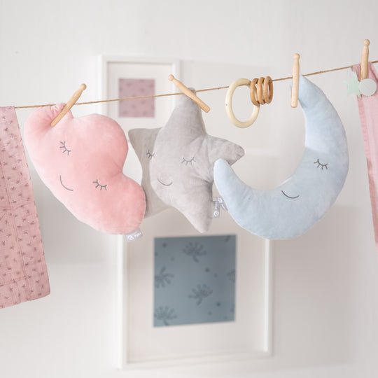 Rosa Kuschelkissen „Stern“ mit niedlichem, aufgesticktem Gesicht. Alle Materialien sind schadstoffgeprüft und zertifiziert. Maße: (HxBxT) 28x32x8 cm. Für Kinder ab 0 Jahren.