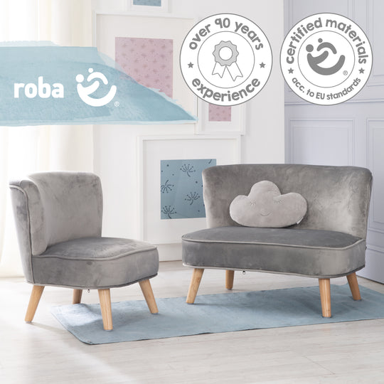 Das roba Bundle „Lil Sofa” besteht aus einem Kindersofa, einem Kindersessel und einem Dekokissen in Wolkenform in der Farbe silbergrau. Die roba Kindercouch und der Kindersessel im trendigen Retro-Look sind mit Samtstoff bezogen, welcher mit seiner pfirsichweichen Oberfläche beeindruckt. Die Möbelstücke stehen auf stabilen Holzfüßen. Dank der kindgerechten Sitzhöhe von 27 cm sind die Garnituren bereits für die Kleinsten äußerst bequem. Auf dem 70 cm breiten Kindersofa finden zwei Kinder gemütlich Platz. Kindersofa: Sitzhöhe 27 cm. HxBxT: 50x70x48 cm. Farbe: silbergrau. Kindersessel: Sitzhöhe 27 cm. HxBxT: 50x 44x48 cm. Farbe: silbergrau. Beide Möbelstücke sind für Jungen und Mädchen ab 18 Monaten geeignet. Passend zu den roba Minimöbeln gibt es weitere Kinder-Sitzmöbel aus der Serie „Lil Sofa“ wie ein Hocker in Sternform, ein Hocker in Herzform sowie ein ovaler Hocker mit Deckel und Aufbewahrungsfunktion. Die roba Sitzmöbel-Serie „Lil Sofa“ entspricht den aktuellen Sicherheitsstandards. Das roba Kuschelkissen „roba Style“ Wolke in der Farbe silbergrau ist herrlich weich und ist für Kinder viel mehr als „nur“ ein Dekokissen. Mit seinem niedlichen, aufgestickten Gesicht wird das Wolkenkissen schnell zum Freund, Beschützer, Spielgefährten, Trostspender oder dient als Einschlafhilfe. Kleinkinder bauen häufig eine enge Bindung zu einem Kuscheltier auf und nehmen es gerne überall hin mit. Das Kuschelkissen vermittelt Ihrem Kind, genau wie ein Kuscheltier, ein Gefühl von Vertrautheit und vermittelt dadurch Kraft und Mut. Unterwegs eignet es sich als weiche Unterlage für den Kopf. Als Dekokissen macht es eine gute Figur im Kinderbettchen oder auf dem Sofa und passt zu jeder Einrichtung im Kinder- und Babyzimmer. Die Kuschelkissen aus der Serie „roba Style“ sind als Wolke, Stern oder Mond in den drei Farben Rosa/Mauve, Hellblau/Sky oder Silbergrau erhältlich. Alle verwendeten Materialien des Kissens sind schadstoffgeprüft und zertifiziert. Maße: (HxBxT) 19x32x9 cm. Für Kinder ab 0 Jahren.