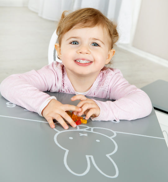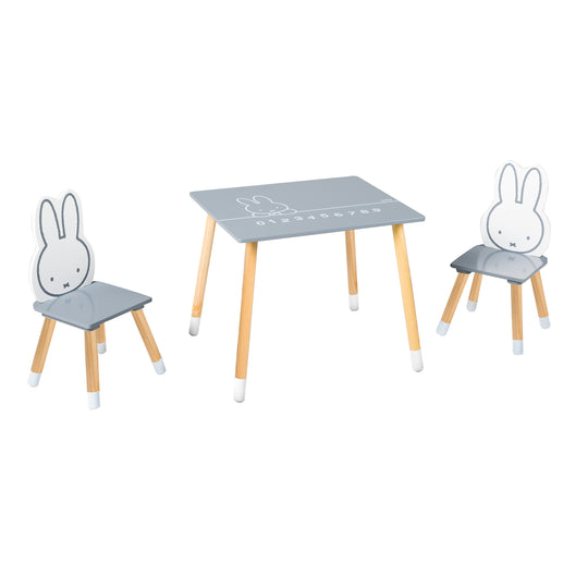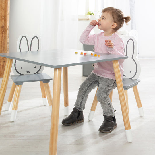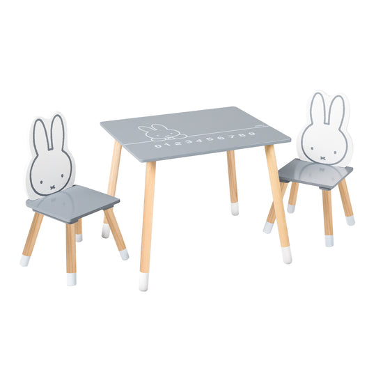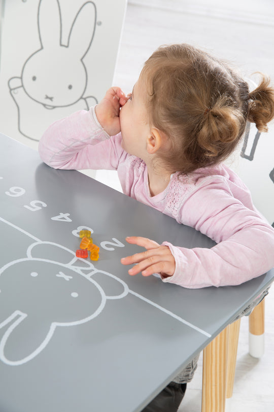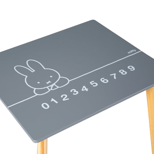 Die Sitzflächen der Kinderstühle und die Tischplatte sind dunkelgrau lackiert. Die Tischplatte ist zusätzlich mit einem niedlichen miffy®-Gesicht und den Zahlen 0 – 9 verziert.