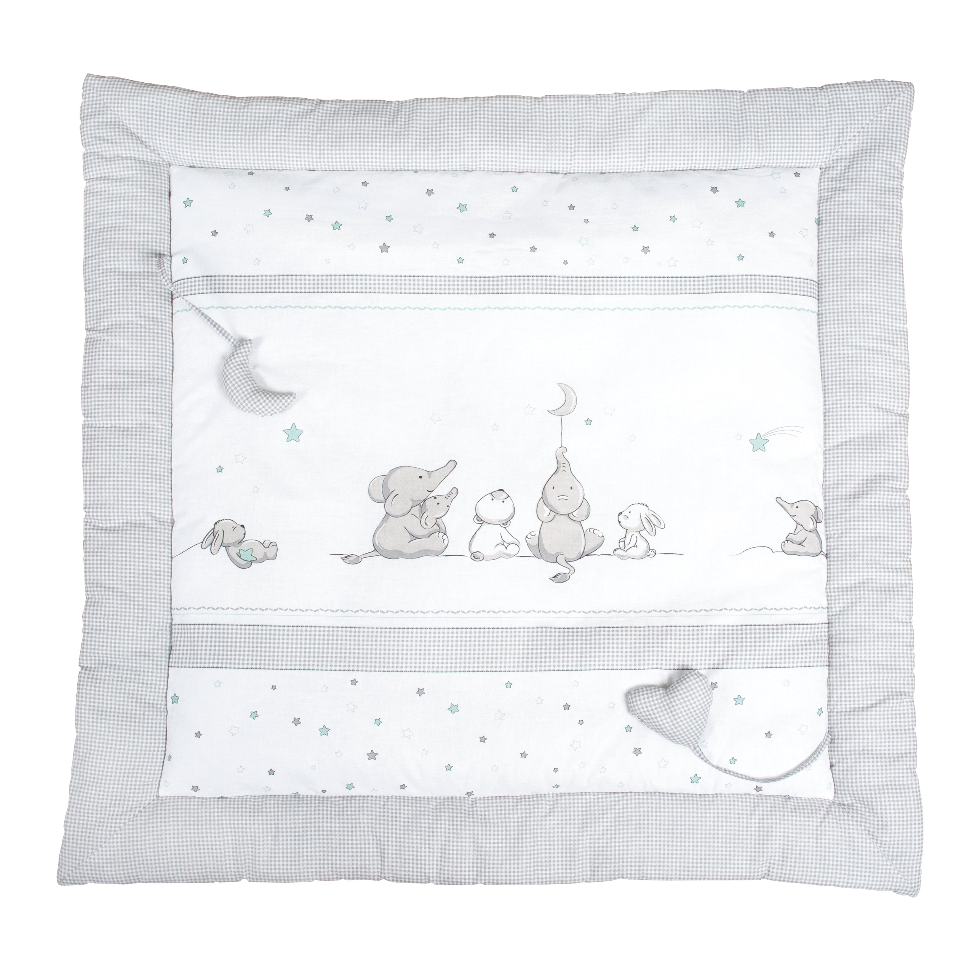 Die gepolsterte Spielunterlage mit zwei Stoffsternen zum Spielen hält dank ihrer weichen Vliesfüllung Bodenkälte fern.