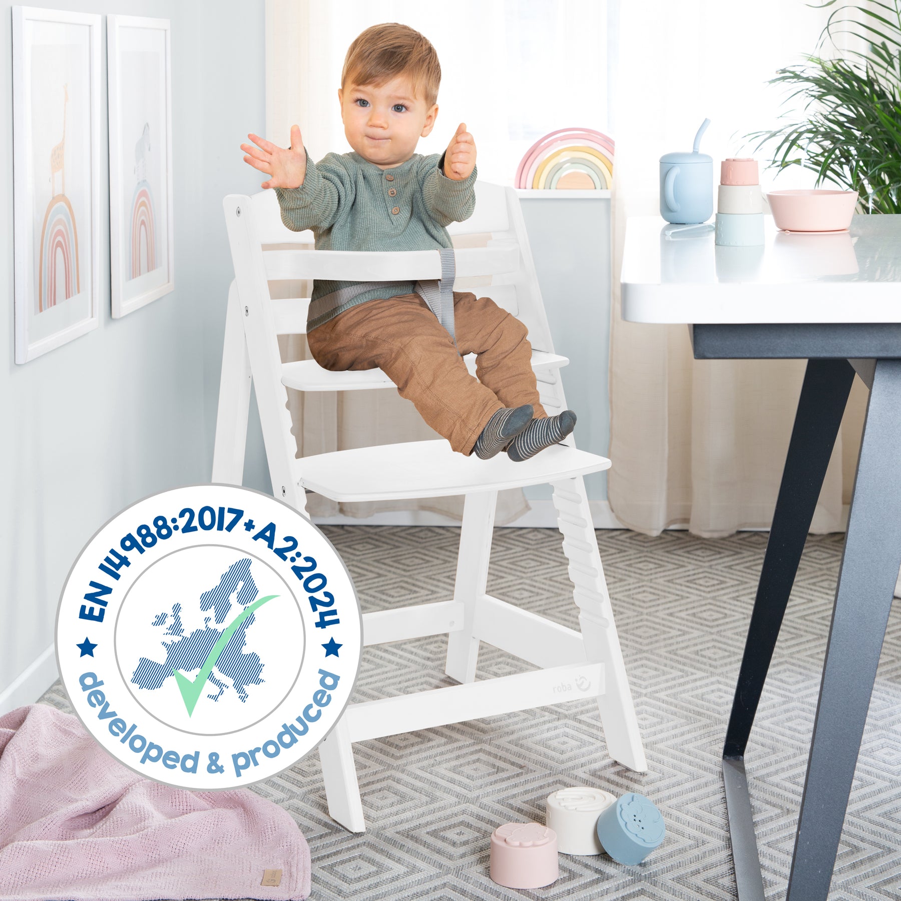 The high chair is produced according to current safety standards (EN 14988-1+2:2006+A1:2012), the materials are certified, and the paint is food-safe and skin-friendly.