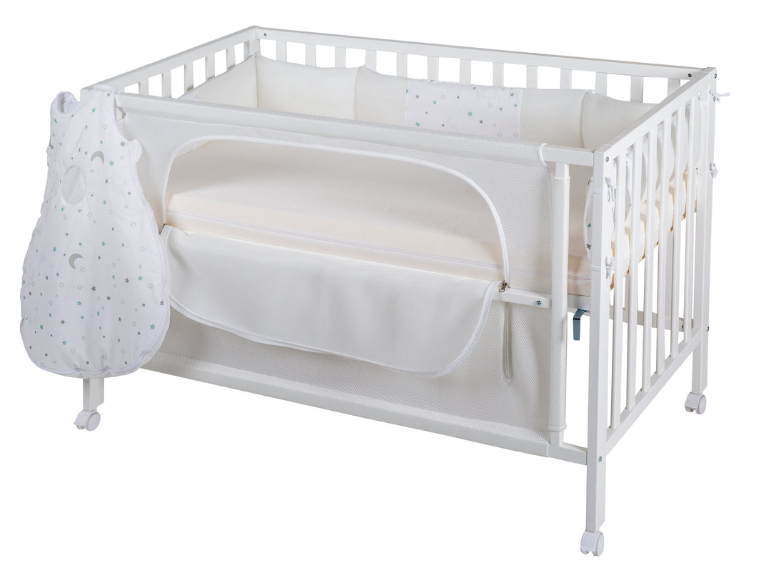 Room Bed 'safe asleep®', 60 x 120 cm, 'Stars Gray', Co-Sleeper Bed including Equipment, White Painted