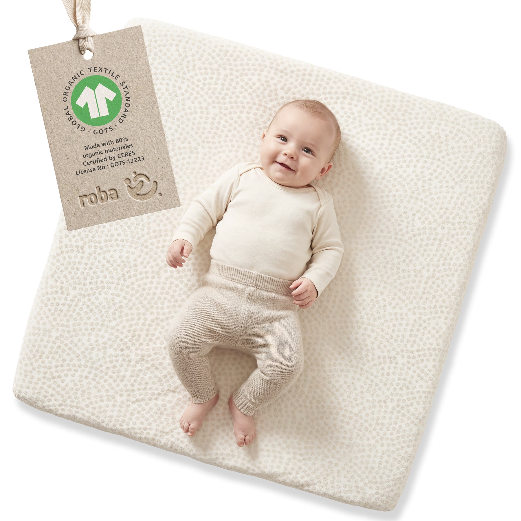 Discover the roba fitted cover for changing pads 85 x 75 cm 'Seashells Oyster' – the perfect companion for the diapering phase, guaranteeing both comfort and safety for your baby. Made from high-quality organic cotton, this cover not only provides an ideal lying surface for your baby but also offers a comforting feeling for environmentally conscious parents. The roba textile series Seashells is sustainably produced according to the Global Organic Textile Standard GOTS and under fair and social conditions as per the Business Social Compliance Initiative (BSCI). The material in the popular Terry-Dots style, made from 80% organic cotton and 20% polyester, perfectly combines softness with durability for long-lasting use, while the attractive Seashells design in the trendy Oyster color adds a modern and stylish touch to your changing area. The removable cover is washable at environmentally friendly 40°C, ensuring easy cleaning and maintenance. The fitted cover is available in the trendy colors Indigo (dark blue) and Oyster (wool white). With the roba fitted cover for changing pads, you not only create a comfortable but also an aesthetically pleasing environment for your baby, which both you and your little one will love.