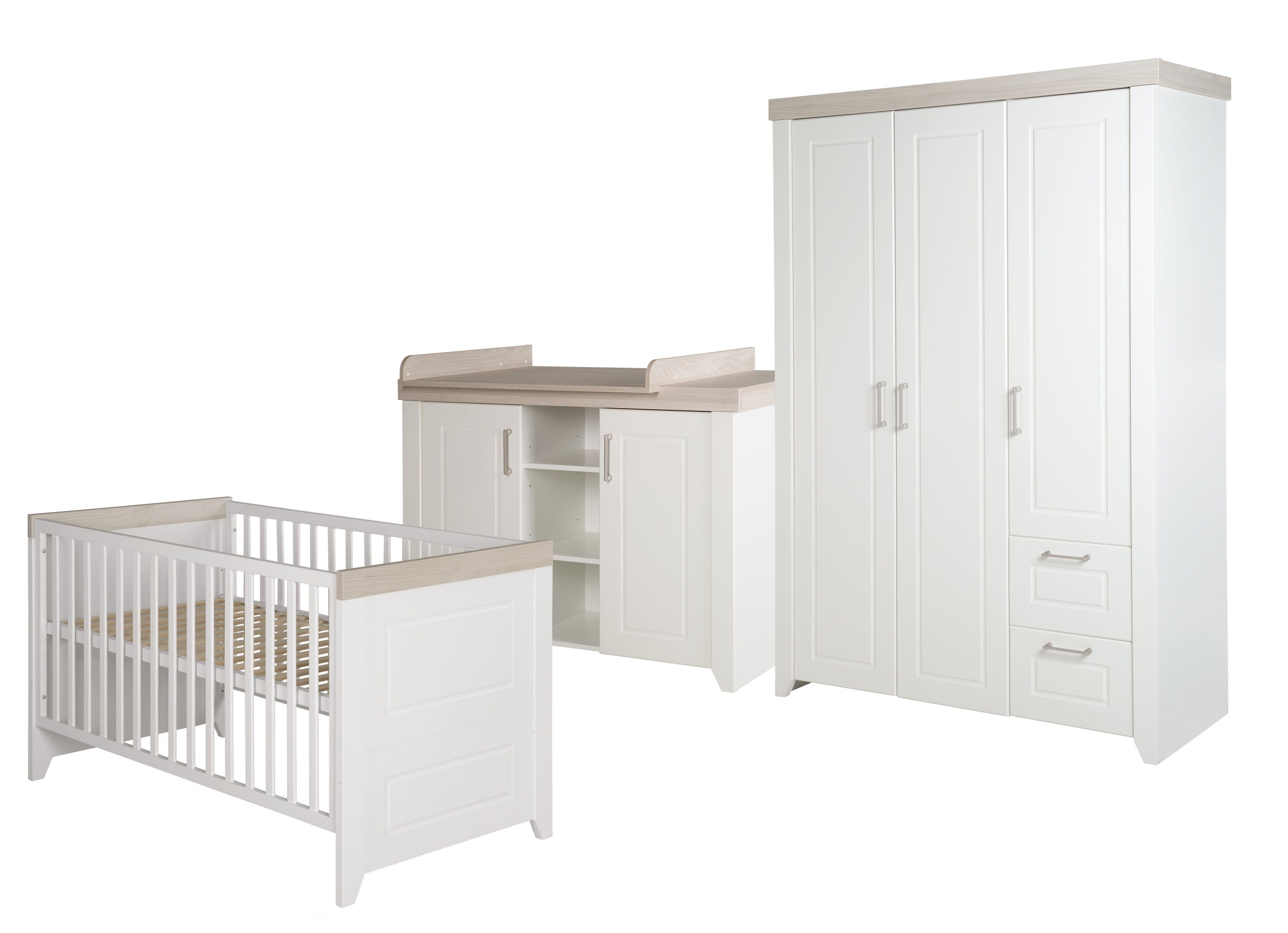 El armario de 3 puertas 'Felicia', con cuerpo en decorado 'Blanco' y frentes en 'Canadian White' con fresado en paneles, es el punto culminante en la habitación de un bebé o niño. La cornisa del armario infantil en decorado 'Luna Elm' y las patas cónicas completan el diseño. Detrás de las 3 puertas con elegantes pomos de metal plateado se esconde un gran espacio para almacenar calcetines, ropa interior, juguetes infantiles o libros. También los dos cajones y la barra para colgar incluida ofrecen mucho espacio para guardar ropa. Gracias a la tecnología Soft Close integrada, las puertas y los cajones se cierran suavemente y en silencio. Los paneles traseros ranurados garantizan una fácil instalación y los soportes metálicos en el suelo brindan la estabilidad necesaria al armario. Este elegante armario de 3 puertas se puede combinar perfectamente con otros muebles para bebés y niños de la serie 'Felicia' para crear una habitación para bebés completamente amueblada, con muebles que crecen con el tiempo. El armario para la habitación del bebé fue desarrollado en Alemania, producido en la UE y es fácil de montar. (H x B x T): 199 x 138,5 x 52,5 cm.