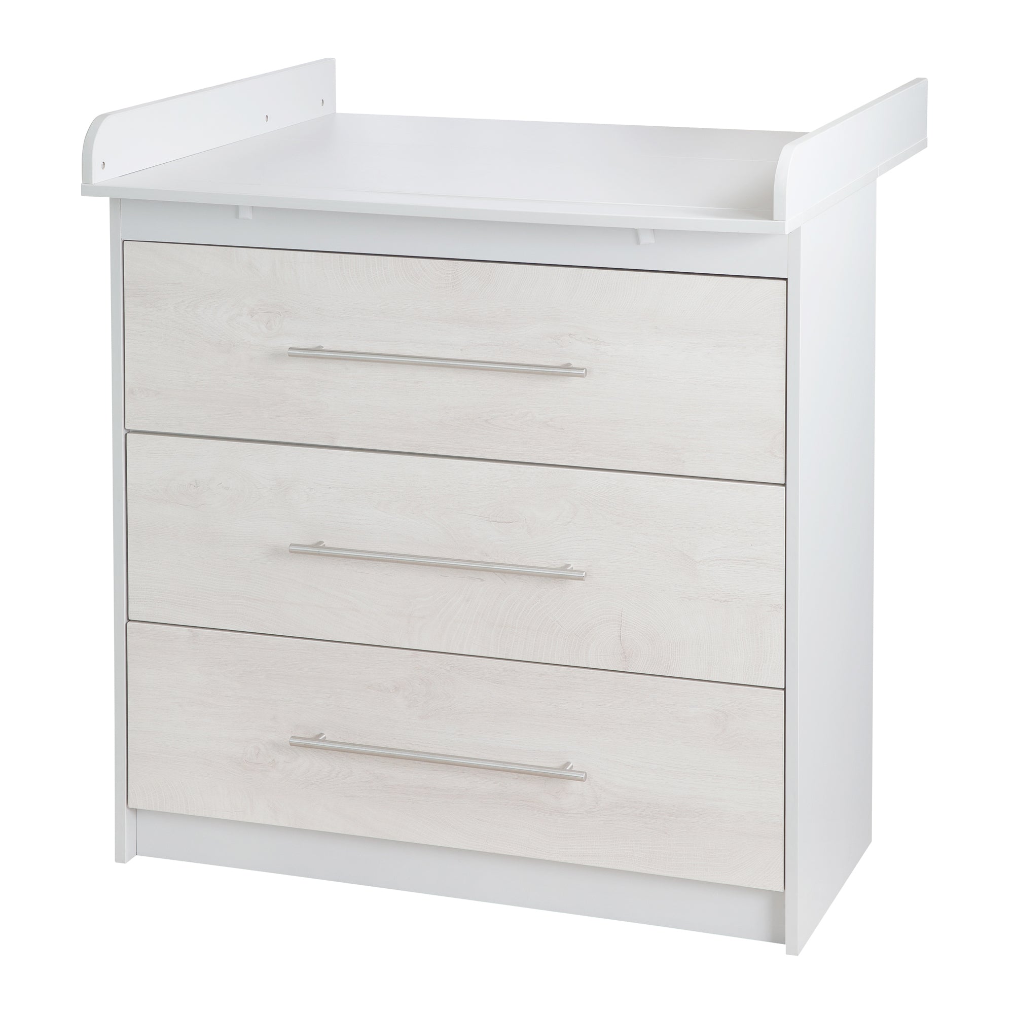 La cómoda para cambiar bebés 'Wilma' con cambiador en moderno estilo de casa de campo convierte el cuidado del bebé en un placer para padres y bebés gracias a su cómoda altura de cambio de 90 cm. La placa de cambio desmontable se puede montar en la cómoda en un abrir y cerrar de ojos. Los cambiadores acolchados de roba en el tamaño de 85 cm x 75 cm convierten la cómoda en un acogedor lugar de cambio en la habitación del bebé. El cierre suave de los 3 cajones es garantizado por la amortiguación de los cajones de la técnica de cierre suave incorporada. El cajón superior de la mesa de cambio se puede sacar completamente y ofrece espacio de almacenamiento para artículos de cambio. Con el deslizamiento completo del cajón superior, tendrá todo lo que necesita para el cuidado del bebé al alcance de la mano. La amplia cómoda para cambiar bebés destaca como un punto de diseño especial con su placa de cambio en decoración 'Luna Elm', que armoniza coloridamente con los frentes y el cuerpo en moderno blanco. Una práctica adición a la cómoda con elegantes fresados y modernos soportes con pies ligeramente inclinados es la estantería adecuada de la serie 'Wilma' (Ref. 1311733). Con más muebles infantiles de la serie, se puede amueblar un elegante dormitorio para bebés o niños. La cómoda para cambiar bebés con cambiador es un verdadero multiusos y le servirá durante muchos años. La estable cómoda para cambiar bebés ofrece un lugar de asiento elevado para su niño en edad preescolar, para que pueda ayudar a vestirse cómodamente de pie. Más tarde, el área de cambio se convierte en una cómoda en su sala de estar o habitación infantil. La cómoda para cambiar bebés con elegantes tiradores de metal y sin tornillos visibles está entre nuestras versiones más amplias. La cómoda para cambiar bebés se ha desarrollado en Alemania y cumple con los estándares de seguridad actuales según EN 12221 – 1+2:2008 + A1:2013. La cómoda para cambiar bebés 'Wilma', fácil de montar, se produce en la UE. H x A: 98 x 120 cm, profundidad con/sin cambiador: 75/42 cm, altura de cambio 90 cm, cuerpo y frentes 'Blanco'. Mesa/cambiador en decoración 'Luna Elm'.