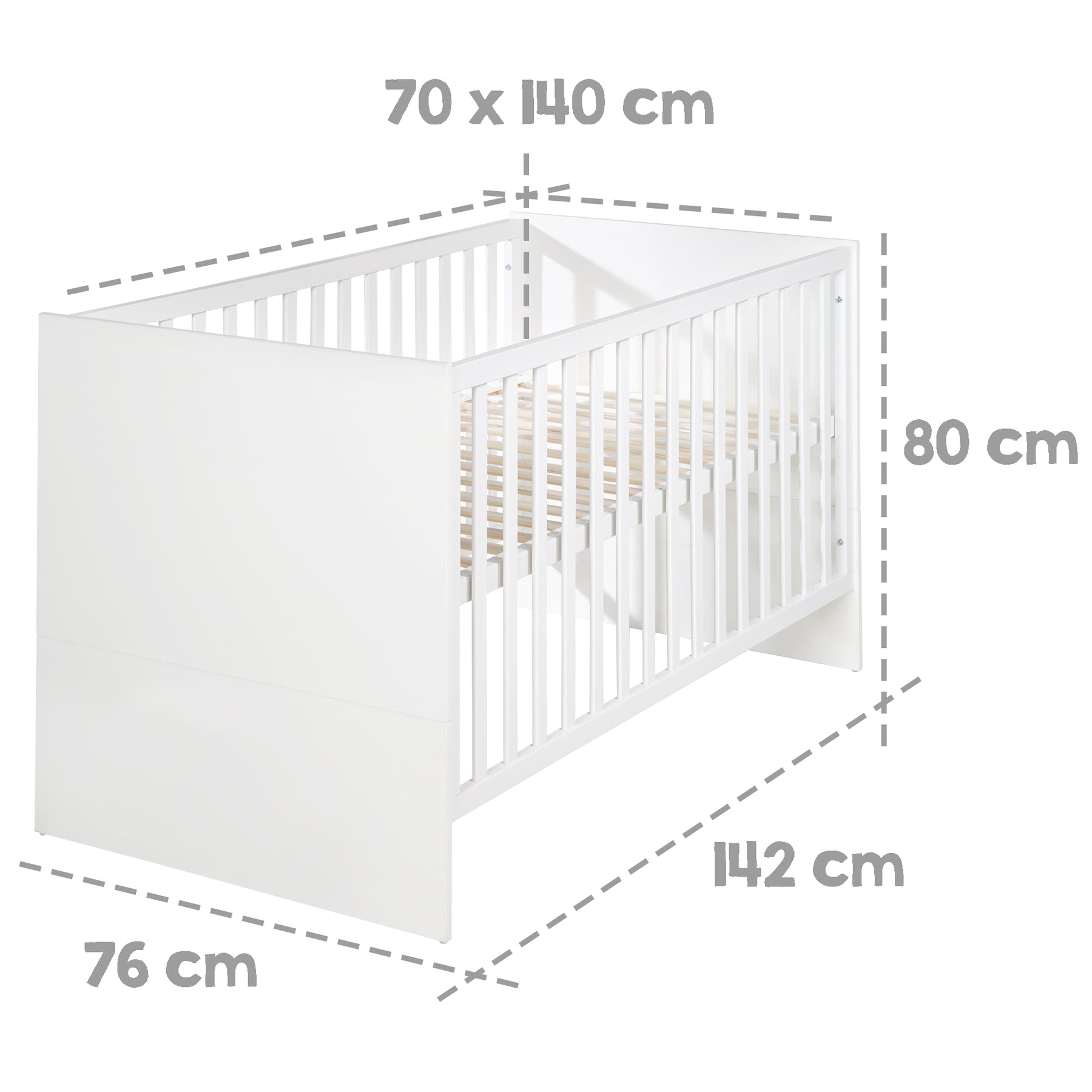 CUNA QUE CRECE CON EL NIÑO: La cuna de 70 x 140 cm ofrece 3 barrotes extraíbles, es ajustable en 3 alturas y se puede convertir más tarde en una cama juvenil con lados de conversión disponibles por separado (N° de art. 10012WE) - Construcción conforme a EN 716-1:2017+AC:2019.