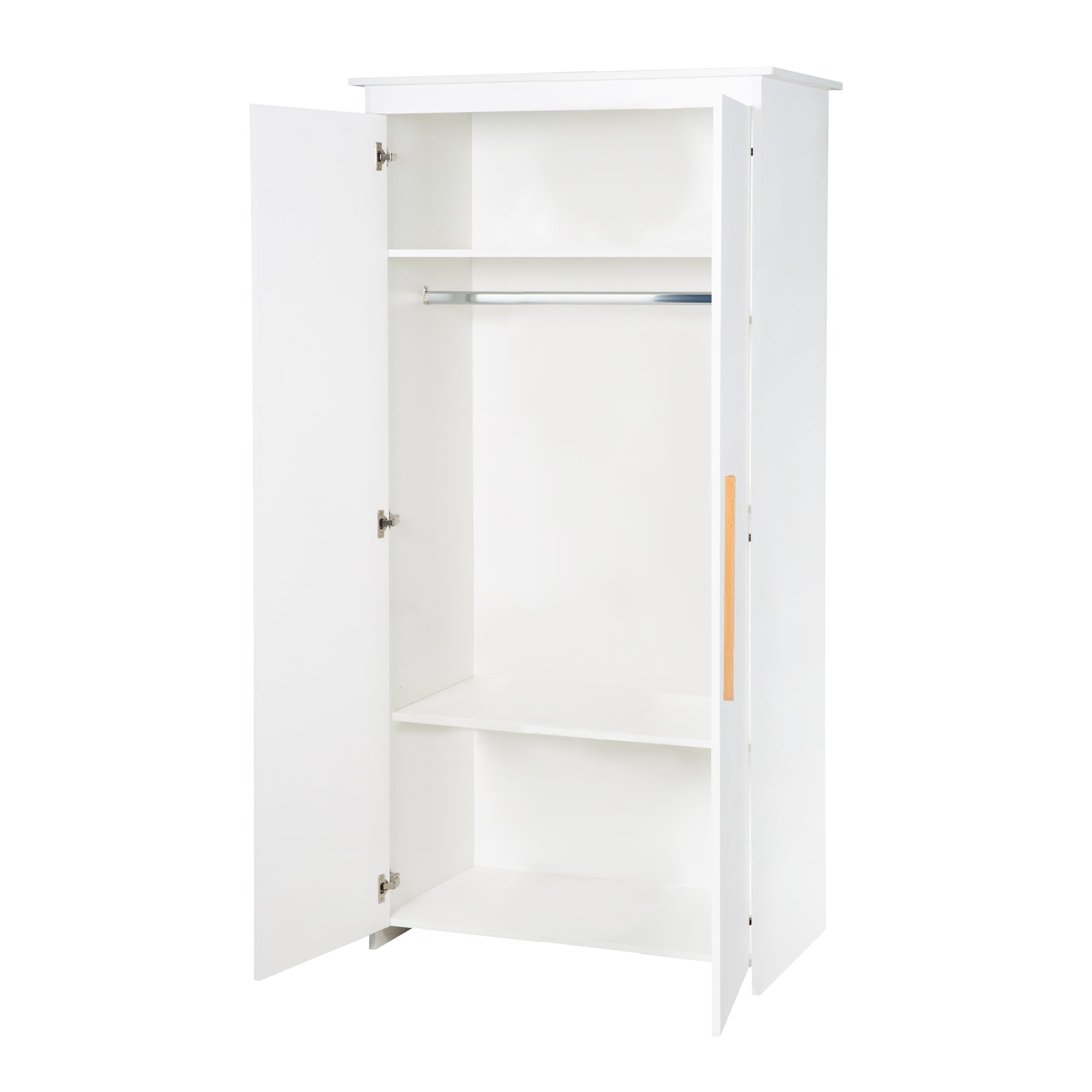 ARMARIO INFANTIL: 5 compartimentos separados con 2 barras para ropa cortas (de 66 cm cada una) - Dimensiones: H 190 x B 115 x L 50 cm - Bisagras de cierre suave - Lacado blanco atemporal y tiradores de madera para una elegancia moderna.