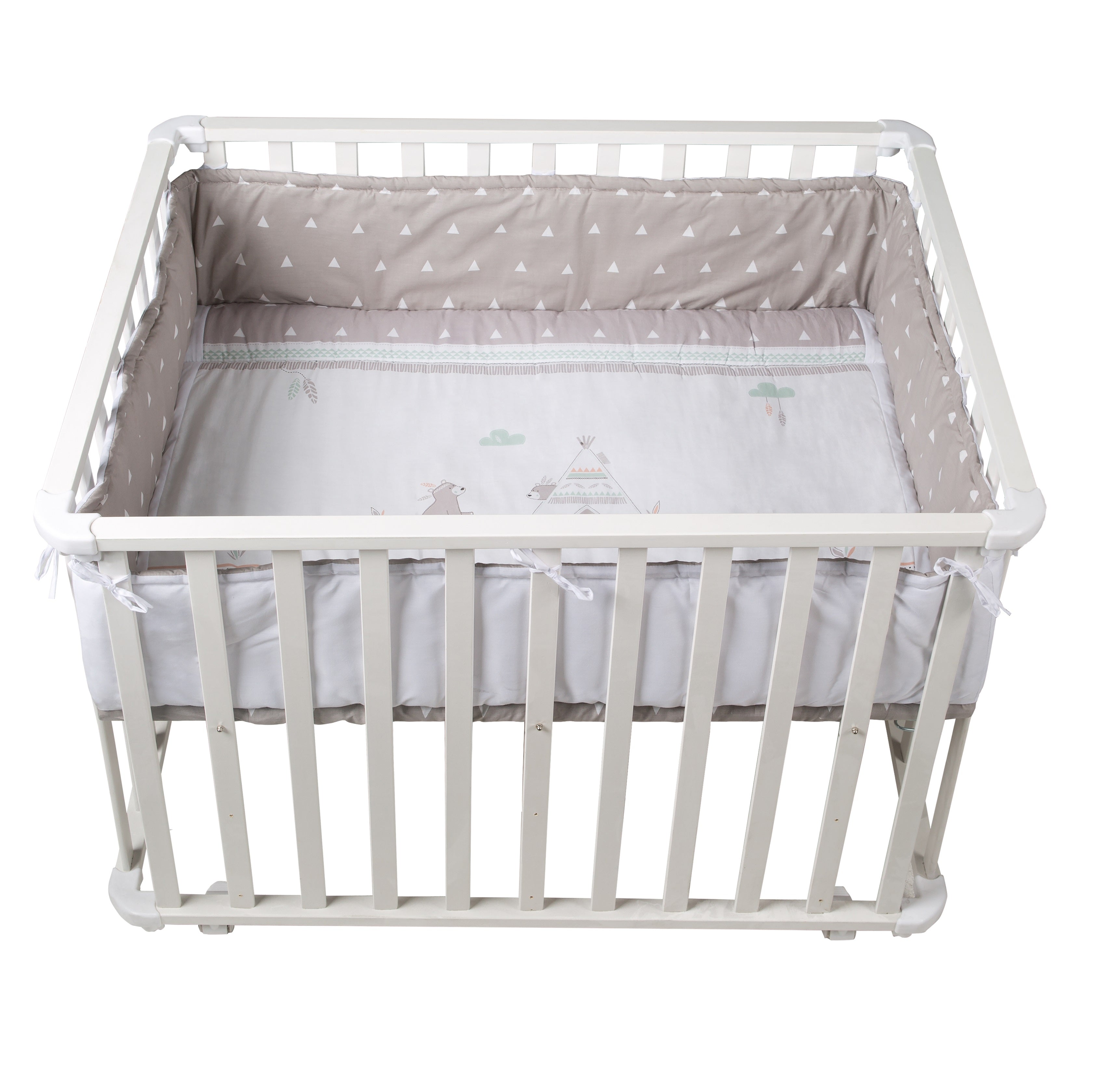 El parque infantil blanco de 75 x 100 cm de madera viene equipado con un suave inserto textil y varillas planas, ofreciendo la mejor protección alrededor gracias al acolchado del inserto textil como un nido.