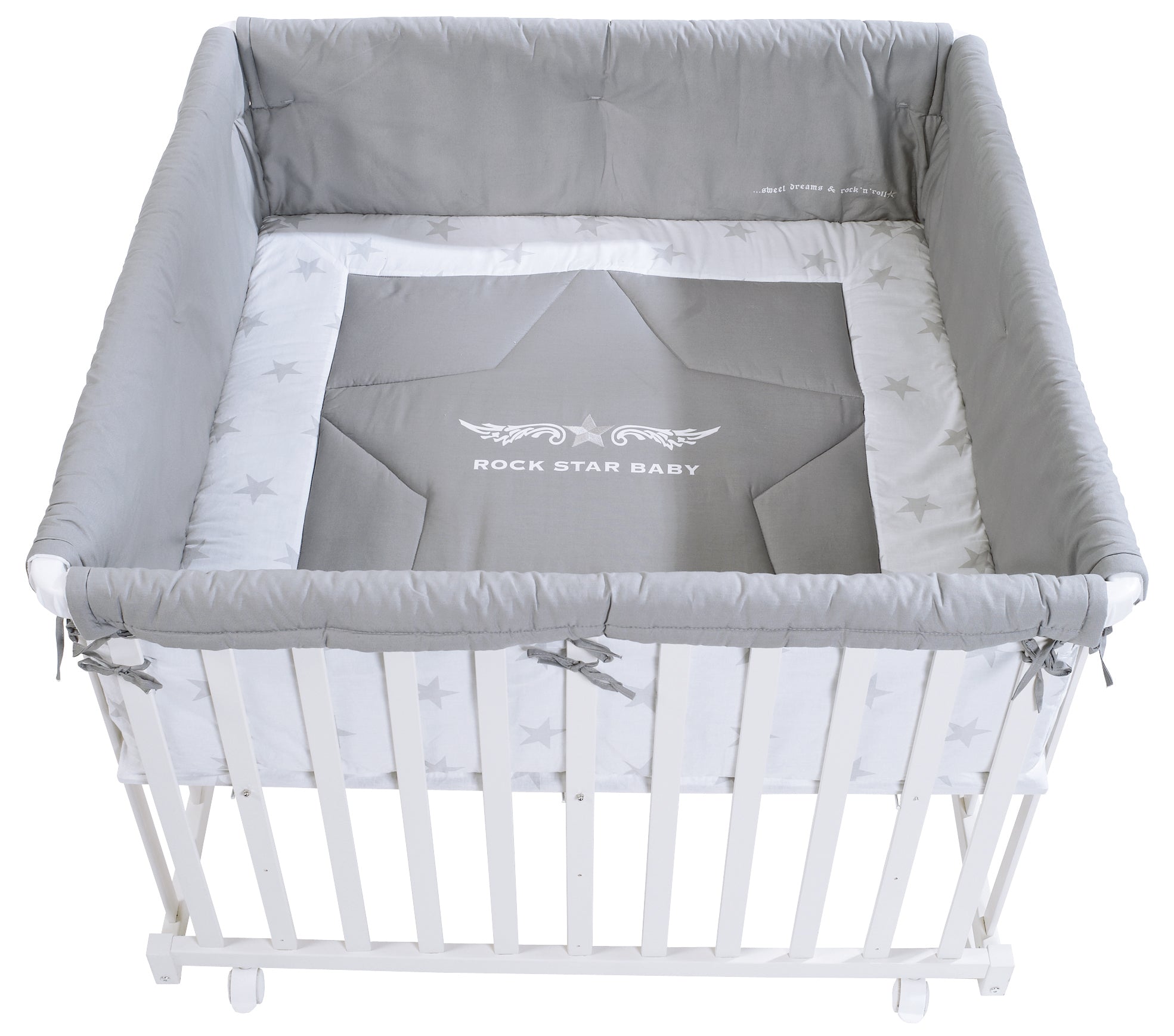 Le parc bébé en bois carré est équipé d'un insert textile douillet et de barres plates, offrant la meilleure protection avec le revêtement en tissu rembourré.