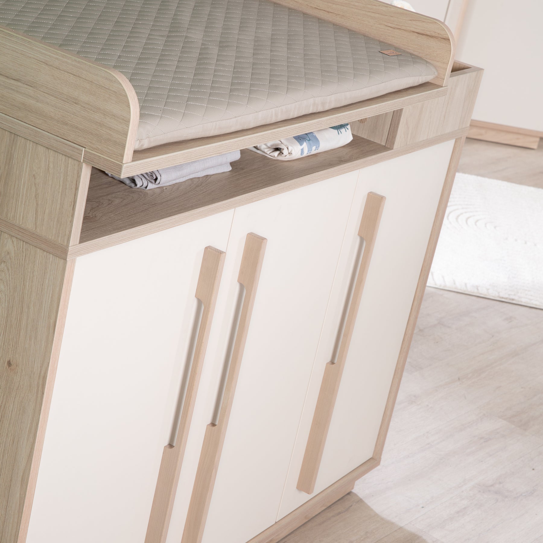 🧸 Commode à langer avec hauteur de change de 93 cm, espaces ouverts, portes à fermeture soft-close et plan à langer amovible – utilisation durable