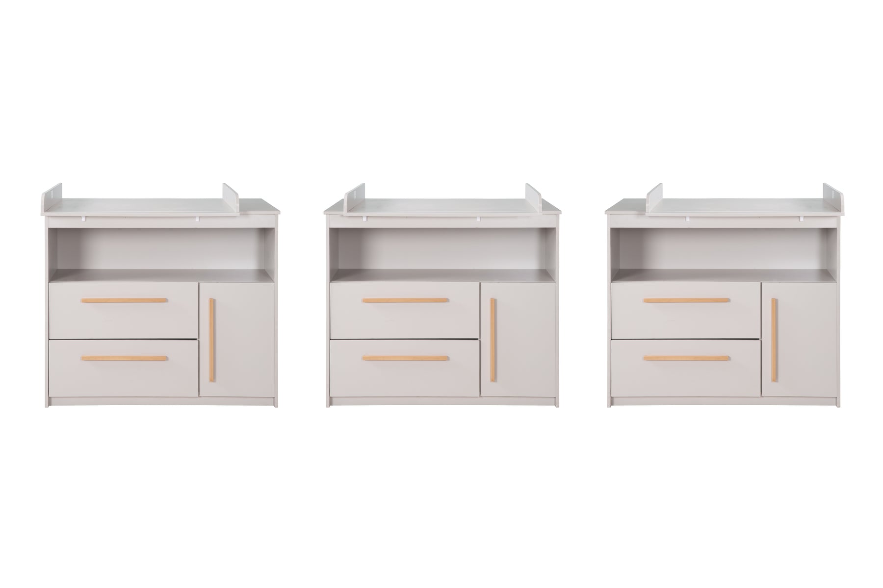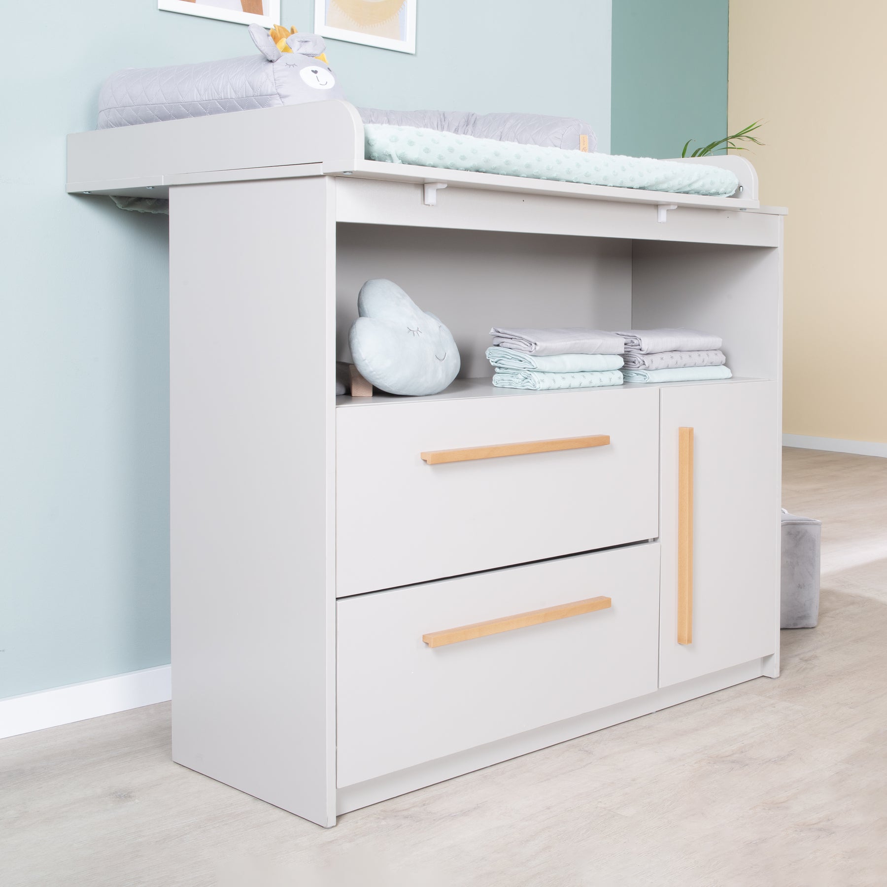 Commode à langer Lea avec matelas à langer amovible - Table à langer avec 2 tiroirs & 1 porte - Poignées en bois - Beige / Gris