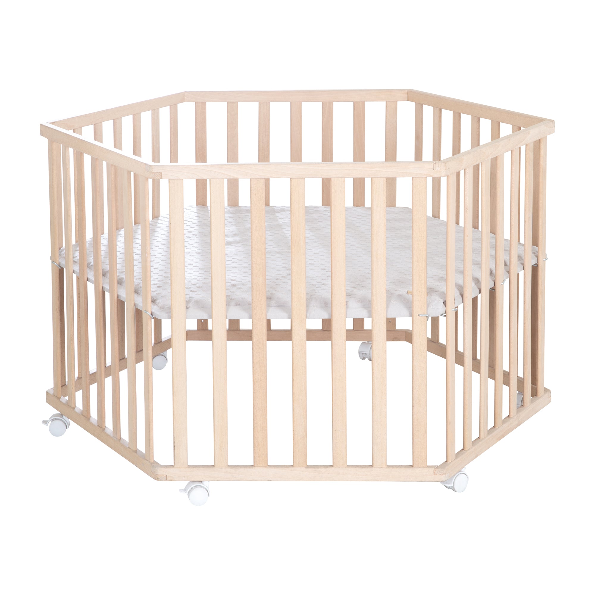 Le parc hexagonal en bois est équipé d'une doublure textile douillette et de barreaux plats et offre la meilleure protection grâce à la doublure en tissu rembourrée.