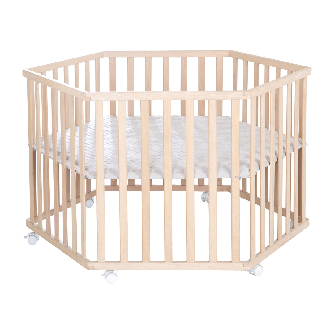 Parc bébé 'Adam et Eule', hexagonal, incl. revêtement de protection et roulettes, bois blanc
