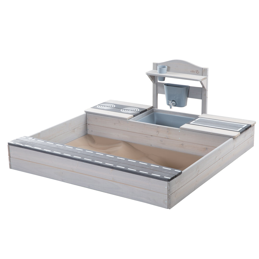 Bac à sable en bois - Design avec route, plaque de cuisson et bac de jeu - Naturel / Noir