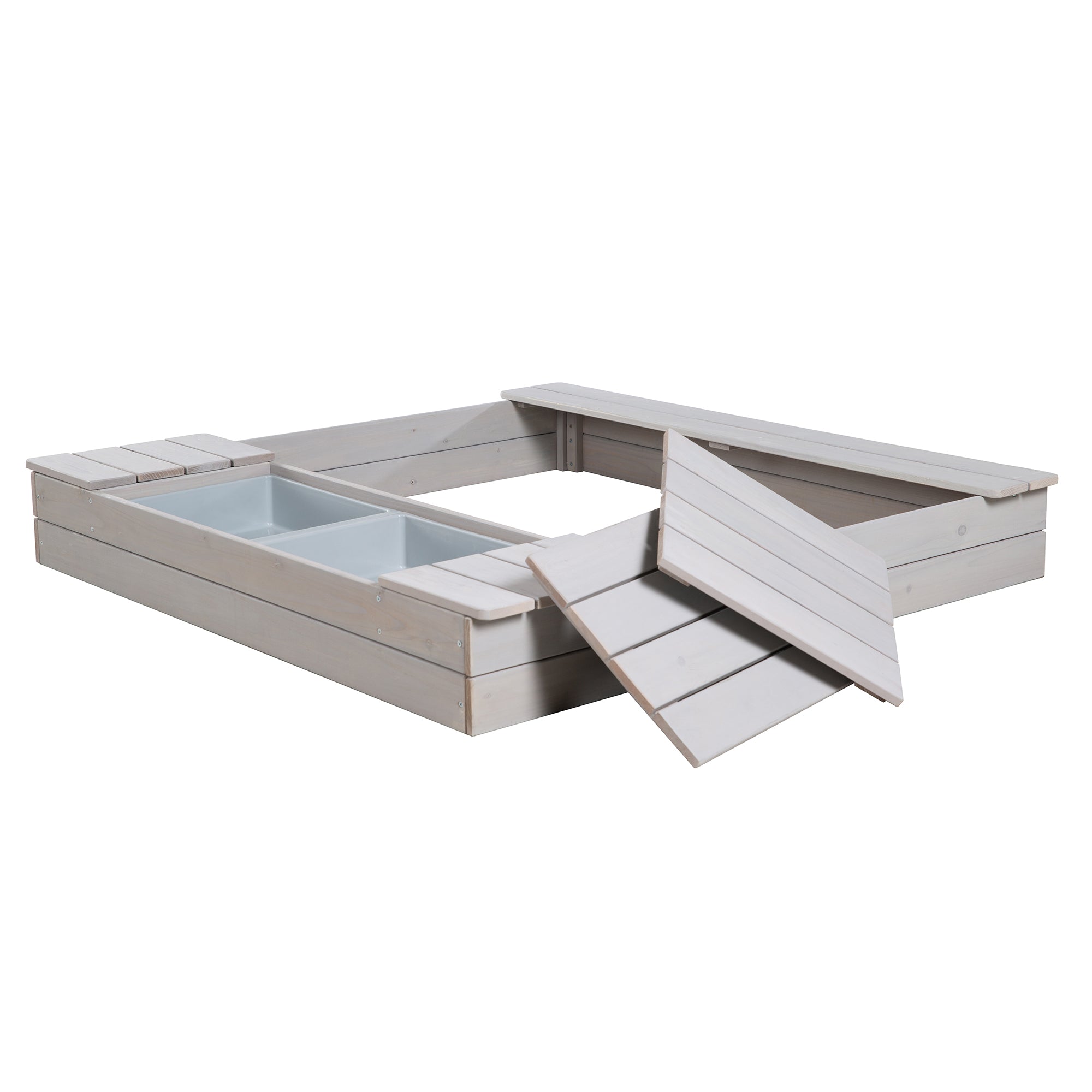 Bac à sable avec couvercle dépliable pour former 2 sièges, bois massif, résistant, gris
