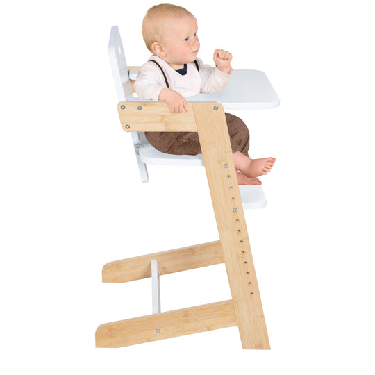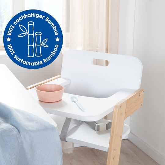 La chaise haute "Nature Up" Bi-Color de la nouvelle collection de chaises hautes roba allie durabilité, design moderne et fonctionnalité optimale. L’association de bambou massif pour les côtés et d’éléments en MDF laqué blanc pour l’assise, le dossier, le plateau et le repose-pieds lui confère une allure moderne et intemporelle, parfaite pour toute cuisine. La structure est laquée dans des tons naturels et blanc élégants, offrant une construction robuste et durable. La chaise haute ajustable (H 86 x L 45 x P 50 cm) accompagne votre enfant dès 6 mois jusqu’à l’âge adulte et supporte une charge allant jusqu’à 70 kg. Le plateau amovible offre une flexibilité supplémentaire, permettant une utilisation en tant que chaise haute autonome ou comme chaise au sein de la table familiale. Grâce à sa conception robuste, la chaise reste stable, tandis que la poignée pratique facilite son déplacement – la chaise haute est légère tout en restant très stable. Les surfaces lavables et faciles à entretenir rendent cette chaise parfaite pour un usage quotidien. La chaise répond également à la norme EN 14988:2017+A1:2020, garantissant les standards de sécurité les plus élevés. Produit par roba, le modèle Nature Up Bi-Color incarne la durabilité, le design moderne et une fabrication écologique – le choix idéal pour les familles soucieuses de l’environnement et du style.