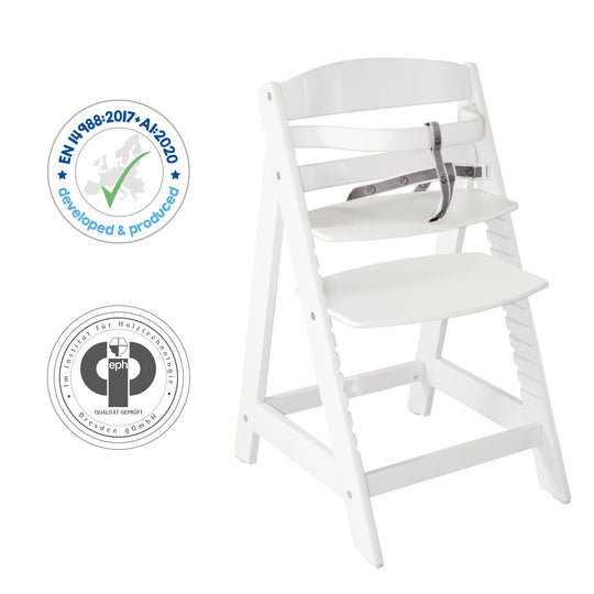 La chaise haute est produite conformément aux normes de sécurité en vigueur (EN 14988-1+2:2006+A1:2012), les matériaux sont certifiés et la laque est sûre pour les aliments et la peau.