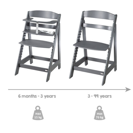 La chaise haute se caractérise par une grande résistance au basculement, des étriers de rangement amovibles et un système de ceinture à 3 points. De plus, elle est parfaitement adaptée aux différentes hauteurs de table grâce à son réglage.