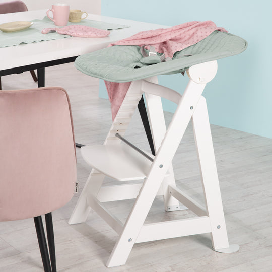 La chaise haute évolutive roba "Born Up" au design moderne 'roba Style' vert givré est livrée en kit complet avec chaise haute d'escalier et fixation réglable incluse. La chaise haute avec fixation pour votre bébé convient de 0 à 6 mois et jusqu'à 9 kg. Sans l'accessoire, la chaise est le compagnon idéal de votre enfant jusqu'à l'adolescence et peut être chargée jusqu'à 50 kg maximum. Le set 2in1 se compose d'une chaise haute en bois blanc qui grandit avec votre bébé et d'un support réglable dans lequel votre bébé s'allonge confortablement et en toute sécurité. L'accessoire peut être réglé en position de sommeil et d'alimentation par simple pression sur un bouton. La chaise haute avec système de harnais à 3 points offre un confort d'assise ergonomique, sûr et adapté à votre enfant jusqu'à l'adolescence. La chaise haute pour bébé avec fonction d'inclinaison et système de harnais à 5 points offre une longue utilisation et une durabilité dès la naissance. Le niveau supérieur de la chaise haute Born Up est conçu pour les tout-petits. Après avoir retiré facilement la barre de protection et le système de harnais, la chaise haute d'escalier se transforme progressivement - grâce à l'assise ou au repose-pieds à hauteur variable et amovible - en chaise pour jeunes. Les produits de style roba, modernes et de haute qualité, sont équipés de textiles en microfibre matelassée et facile à entretenir. Ils convainquent par leur look contemporain, qui s'intègre dans chaque salon et chambre de bébé, et par leur toucher doux. Découvrez d'autres articles pratiques pour bébé de la série roba Style, tels que.. : Couvertures à ramper, lits pour bébé, matelas à langer de sécurité, inserts pour parc d'enfant et bien plus encore. La chaise haute avec système de harnais à 3 points a été développée en Allemagne conformément à la norme actuelle DIN EN 14988:2017. L'attache avec système de harnais à 5 points a été développée de manière à résister au basculement conformément à la norme EN 12790:2009 en vigueur en Allemagne. Tous les matériaux utilisés sont testés pour les substances nocives et certifiés. Matières : Bois moulé et contreplaqué. Chaise haute (sans accessoire) : LxlxH : 44,5x54x80 cm. Hauteur d'assise max. 55 cm, min. 42 cm. Couverture lavable à 40° C. Couleur : blanc.