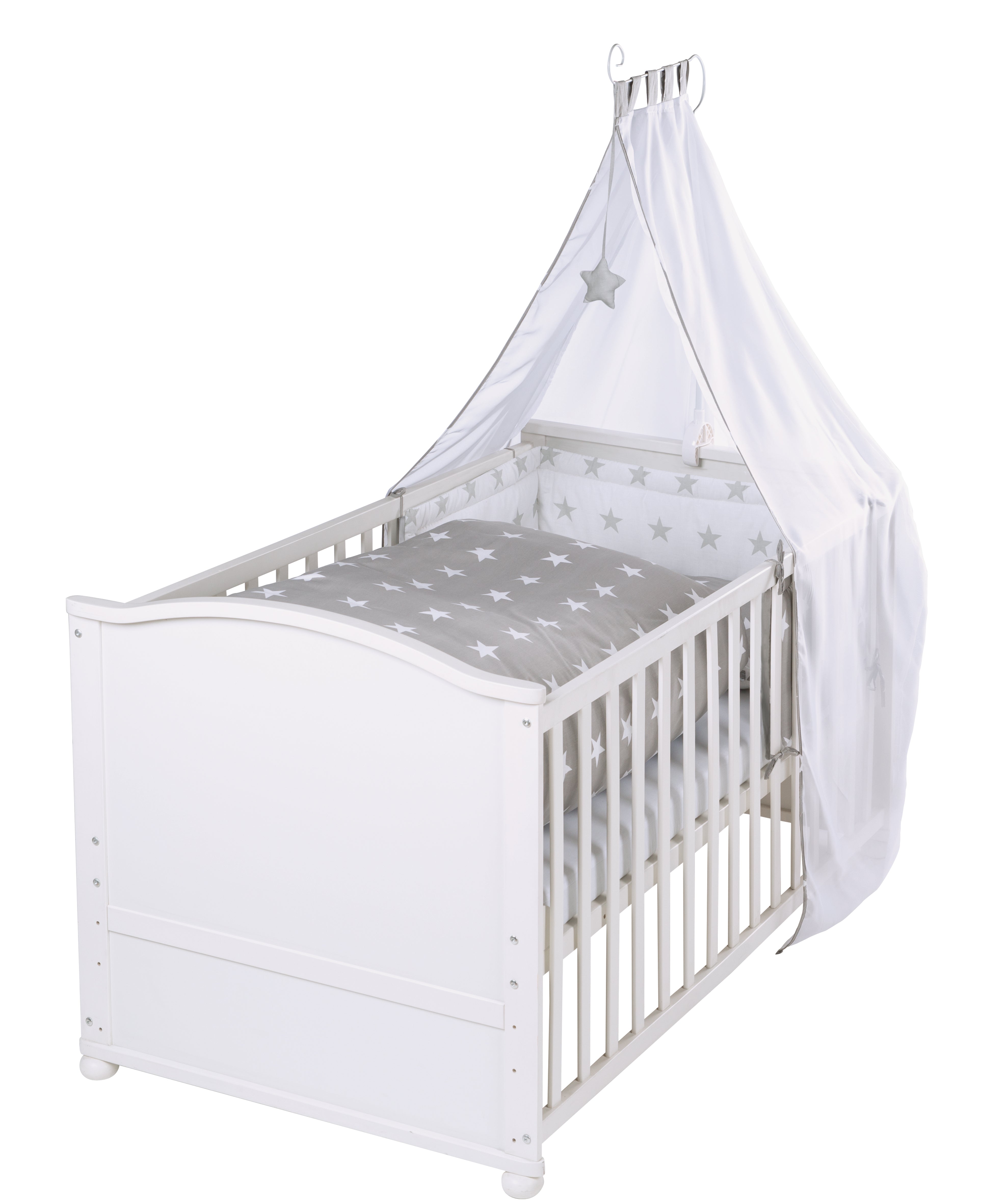 Le set de lit d'enfant 'étoiles grises' de roba comprend un lit combiné, du linge de lit dans un joli design d'étoiles, un petit nid douillet rembourré, un matelas ainsi qu'un ciel de lit avec une barre de ciel.