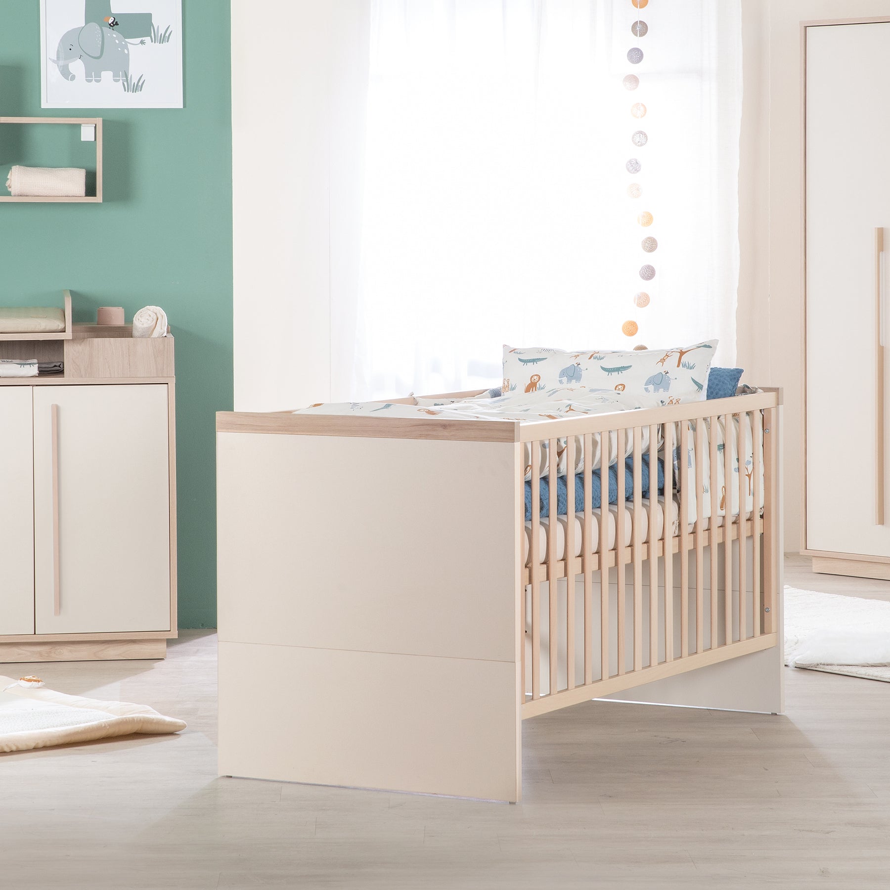 Découvrez le lit bébé combiné Elva de roba, élégant et fonctionnel, parfaitement adapté aux bébés dès la naissance jusqu’à la petite enfance. Avec une surface de couchage de 70 x 140 cm, le lit offre suffisamment d’espace pour dormir et grandir. Le sommier réglable sur 3 hauteurs permet de soulever bébé de manière ergonomique au début et garantit une sécurité maximale lorsque l’enfant devient plus mobile, avec des hauteurs de couchage de 50,5 cm (haute), 32 cm (intermédiaire) et 21,5 cm (basse). Grâce aux trois barreaux amovibles, l’enfant peut ensuite sortir du lit de manière autonome sans compromettre la sécurité. À l’aide de côtés de transformation disponibles séparément (réf. 10011VC ou 10011CM), le lit se transforme facilement en lit junior, représentant un investissement durable pour les premières années de vie. Fabriqué conformément à la norme européenne EN 716 – 1:2017 + AC:2019, le lit séduit par son design moderne en coloris cachemire (gris clair) associé à un décor bois Virginia Chestnut. Produit dans l’UE, le lit bébé Elva allie sécurité, confort et design pour une chambre d’enfant moderne.