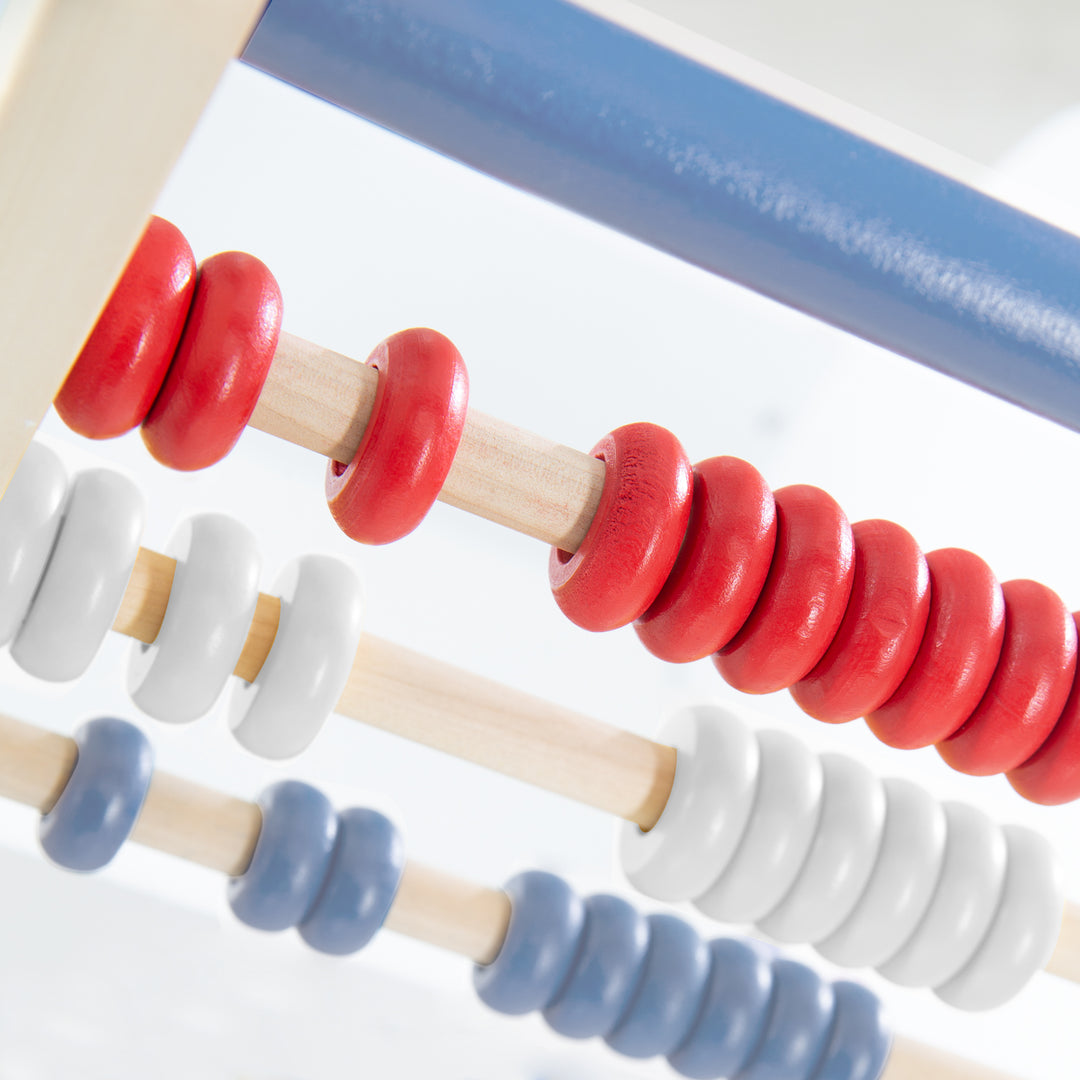 MOLTEPLICI OPPORTUNITÀ DI GIOCO: Colorato autobus da spingere con vari elementi di gioco - Abaco per comprendere i numeri sul manico - Giochi rotatori per lo sviluppo motorio sui lati del carro - Orologio per imparare a leggere l'ora sul retro.