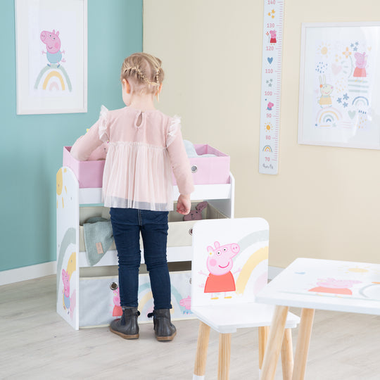 DESIGN PEPPA PIG: Bellissimo scaffale di stoccaggio per bambini con il tema amato dei personaggi dei cartoni animati della serie Peppa Pig - Personaggi della serie stampati con temi arcobaleno.