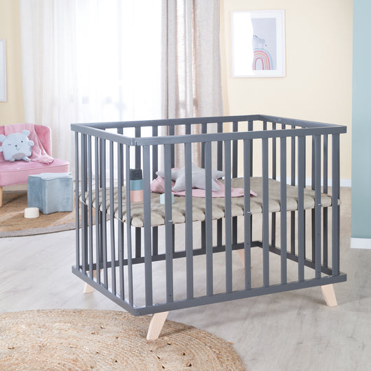 Il box per bambini roba 75x100 cm 'Luxe Greyish trapuntato' con eleganti piedi in legno massello di faggio offre un'ampia, sicura e stabile superficie di gioco e coccola, sulla quale il vostro bambino si sentirà a proprio agio e potrà giocare in sicurezza. Dispone di un rivestimento imbottito grigio chiaro che garantisce al vostro bambino un supporto morbido e confortevole. I bastoni piatti del box garantiscono la massima sicurezza e una buona visibilità sul bambino da tutti i lati. Il box può sostenere un peso fino a 15 kg ed è un meraviglioso e sicuro luogo di gioco dalla nascita fino a 24 mesi di età. Grazie alla regolazione dell'altezza su tre livelli, è possibile adattare l'altezza della superficie di riposo, offrendo così posizione comoda al vostro bambino (scaglionamento: 10, 25, 40 cm). Questo rende il box particolarmente amico della schiena per voi come genitori. I quattro eleganti piedi in legno massello garantiscono una stabilità particolare e un'ottima tenuta. Il fondo imbottito in pelle vegana trapuntata è facilmente pulibile e realizzato in modo di alta qualità. Il legno è amico dei bambini e privo di schegge, garantendo ulteriore sicurezza. I nostri box per bambini sono stati sviluppati secondo la normativa di sicurezza attuale EN 12227:2010-12, garantendo così la massima sicurezza per il vostro bambino. Inoltre, utilizziamo solo vernici atossiche e neutre per la pelle, controllate regolarmente durante la produzione, per offrire al vostro piccolo una tranquilla e sicura ambientazione. Le dimensioni da montare sono 73 x 98,5 x 77 cm (AxLxP). Il box per bambini roba non è solo sicuro e funzionale, ma anche elegante e raffinato. È un regalo meraviglioso per i futuri genitori che desiderano sapere il proprio bambino al sicuro.
