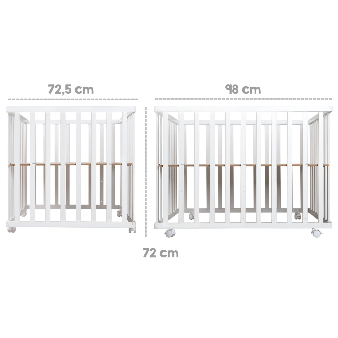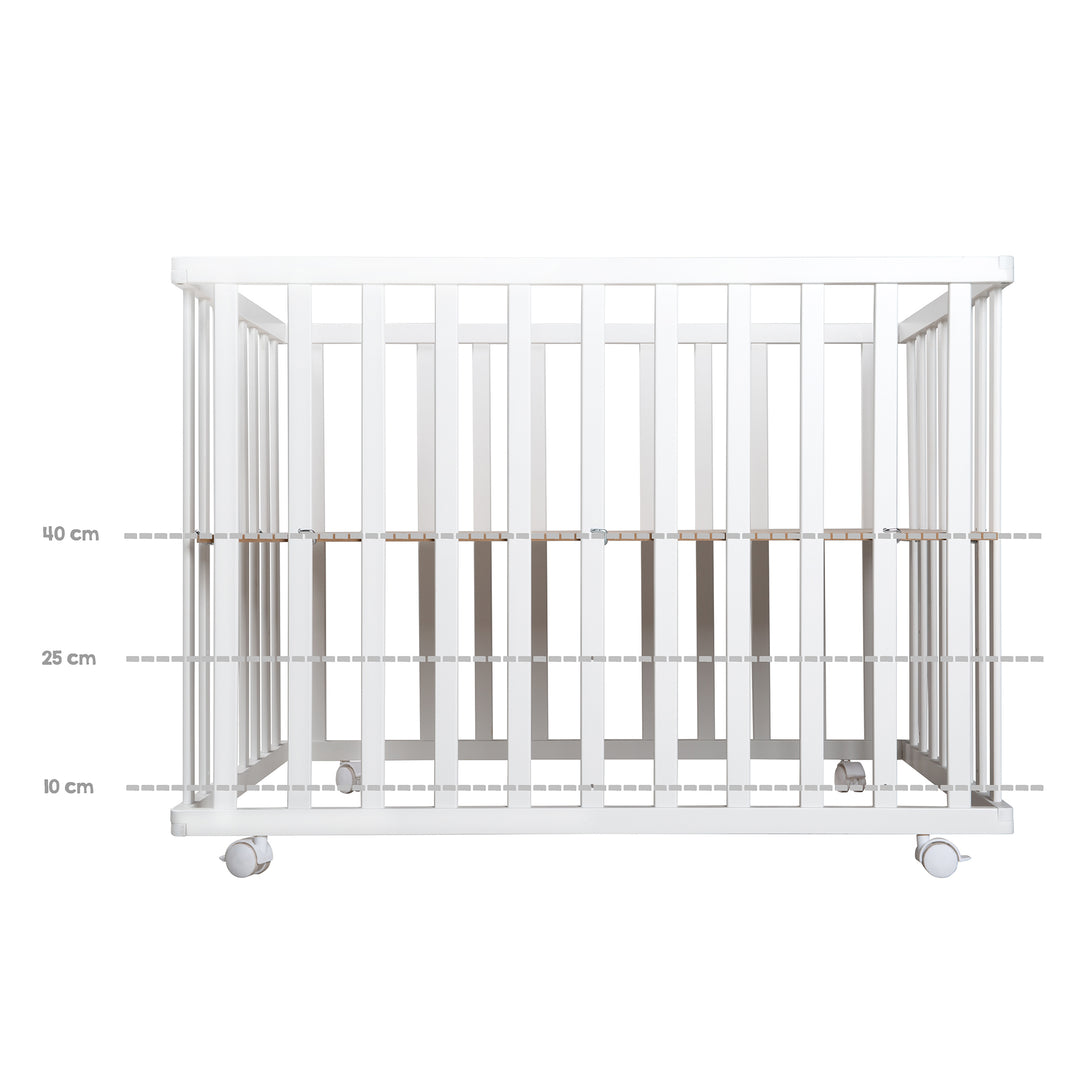 Il parco giochi bianco 75 x 100 cm in legno è dotato di un morbido inserto in tessuto e di barre piatte, offrendo la migliore protezione grazie all'inserto in tessuto imbottito che funge da nido.