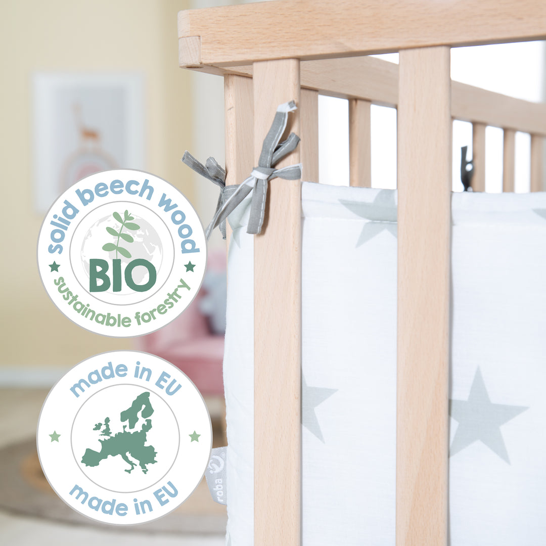 Laufgitter aus Holz sind oft die nachhaltigere Wahl, da sie aus natürlichen, nachwachsenden Rohstoffen gefertigt werden und meist langlebiger sind. Holz lässt sich zudem gut recyceln oder weiterverwenden. ROBA setzt bei seinen Holzlaufgittern auf schadstoffgeprüfte, speichelfeste Lackierungen, die Sicherheit und Umweltfreundlichkeit verbinden.