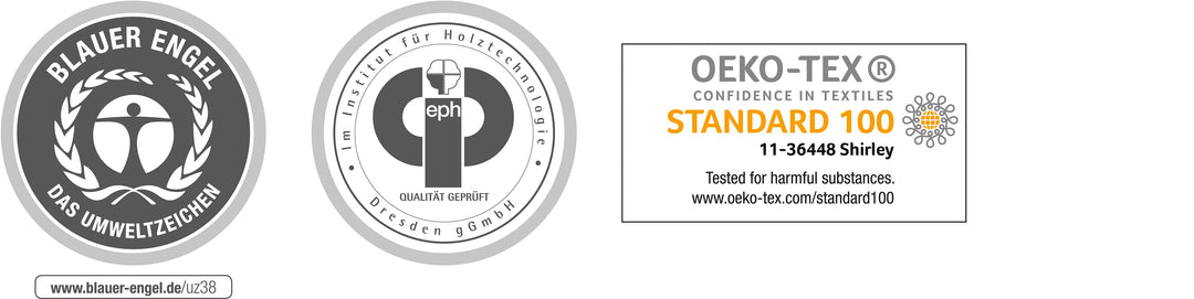 Im Rahmen der Entwicklung bzw. Herstellung unserer Produkte stehen die Gesundheit Ihres Kindes, die Zweckmäßigkeit und eine lange Nutzungsdauer sowie die Umweltfreundlichkeit stets an erster Stelle. Und weil das so ist, lassen wir unsere sicherheitsrelevanten Produkte vom TÜV prüfen und zertifizieren. Ebenfalls sind wir berechtigt das EPH Siegel, das Siegel des blauen Engels und das Öko-Tex-Siegel zu führen.