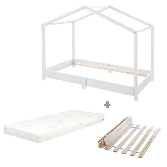 FORMSCHÖNES BODENBETT: Kinderfreundliches Hausbett 70 x 140 cm mit dekorativer Dachkonstruktion - Nachhaltige Verarbeitung dank Verwendung von natürlichen Rohstoffen - Kinderbett im Set mit Lattenrost & Matratze 'safe asleep®' erhältlich.
